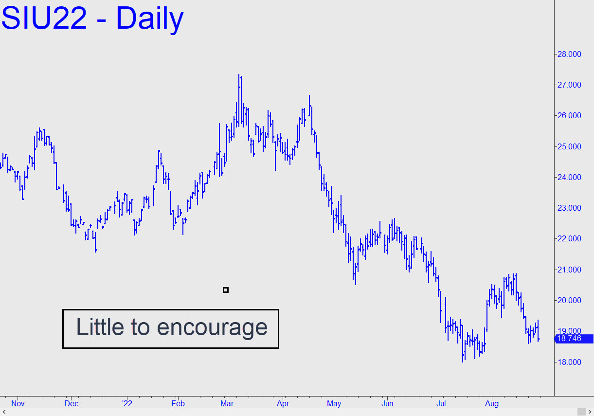 There is little to encourage in the daily chart (see inset), so perhaps contrarians should take heart? We’ll continue to use downside targets at 17.37 and 16.22, although a tradeable turn from p2=18.19 his week is certainly possible (daily, A=21.57 on 6/27). If you’d prefer to be on a hair-trigger for the very first sign of life, set a screen alert at 19.89. A print there would generate a bullish impulse leg on the daily chart, exceeding an ‘external’ peak recorded August 18 on the way down. _______ UPDATE (Sep 3, 10:51 a.m.): The futures have bounced from within a hair of the 17.31 target shown in this chart, but don’t get your hopes too high. _______ UPDATE (Sep 8, 10:03 p.m.): The criminally engineered swoon on the opening triggered an unrecommended ‘mechanical’ buy at the red line, implying that more upside to D=18.81 is a done deal. More bullish still would be an easy move through it on first contact.