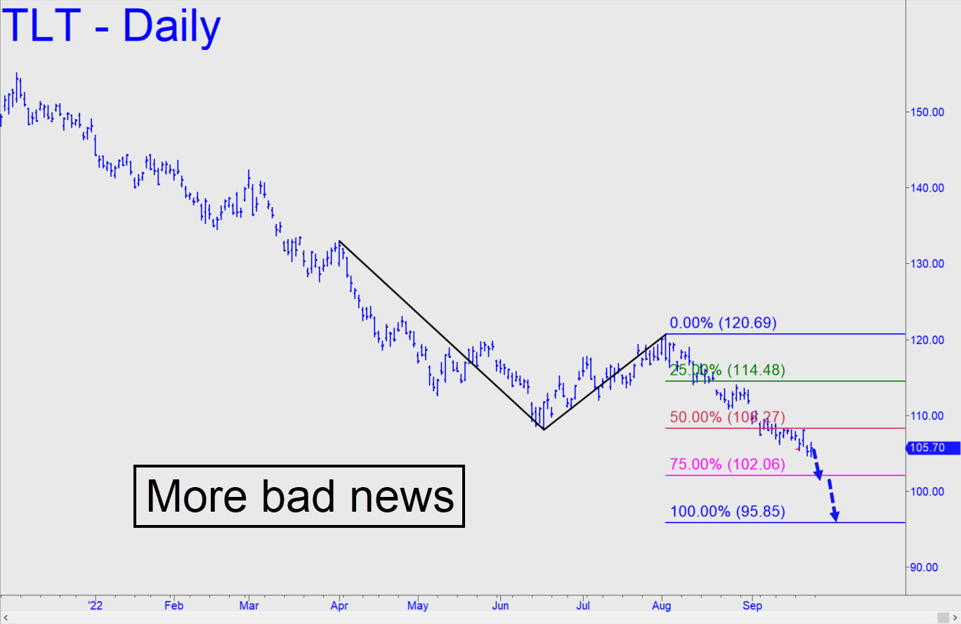 The chart provides precise targets at 103.06 and 95.85 , respectively p2 and D, in lieu of one previously given here at 101.16 that was based on a possible test of lows recorded back in 2013. The higher number looks very likely to be achieved, given the way the C-D leg gapped down through p=108.27 the first time it encountered it and then turned it into upside resistance. It also makes a worst-case plunge to D, if not inevitable, then certainly thinkable. _______ UPDATE (Sep 28, 10:26): That was quite a rally. It came from pennies beneath the 101.16 low mentioned above, and it will very probably need to be tested. However, bulls would gain the upper hand for a rare change if they can push above 108.21 this week or early next. That’s where a shelf of highs was made last week.