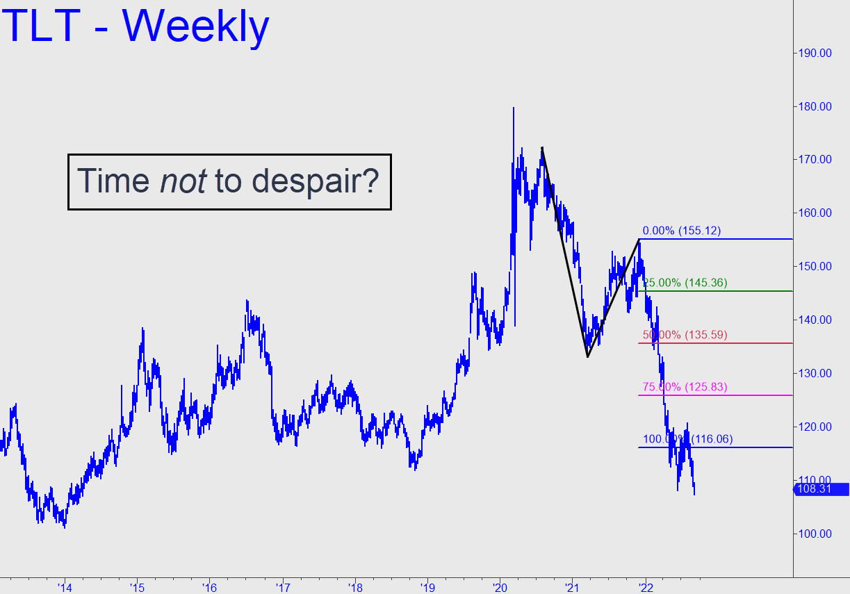 Last week’s plunge to ten-year lows was so dispiriting that perhaps it’s time to prepare for an important turn. My gut feeling is that Friday’s 107.42 bottom lies within a single point or so of a major low that would surely be tradeable. If so, I’d suggest using a ‘camo’ set-up on the lesser charts to leverage a possible reversal. This one is likely to require expert play, but I’ll provide timely guidance in the chat room if interest is strong. ______ UPDATE (Sep 13, 8:57 p.m.): The so-far feeble bounce suggests TLT will continue down to at least p2=102.06 of this pattern before it can turn around. Otherwise, you can use a print at 108.90 as a bullish telltale.