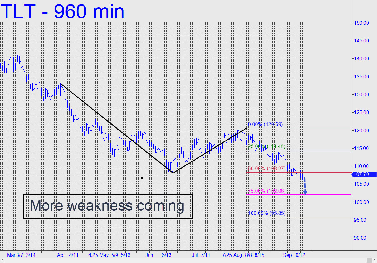 Last week’s plunge to ten-year lows was so dispiriting that perhaps it’s time to prepare for an important turn. My gut feeling is that Friday’s 107.42 bottom lies within a single point or so of a major low that would surely be tradeable. If so, I’d suggest using a ‘camo’ set-up on the lesser charts to leverage a possible reversal. This one is likely to require expert play, but I’ll provide timely guidance in the chat room if interest is strong. ______ UPDATE (Sep 13, 8:57 p.m.): The so-far feeble bounce suggests TLT will continue down to at least p2=102.06 of this pattern before it can turn around. Otherwise, you can use a print at 108.90 as a bullish telltale.