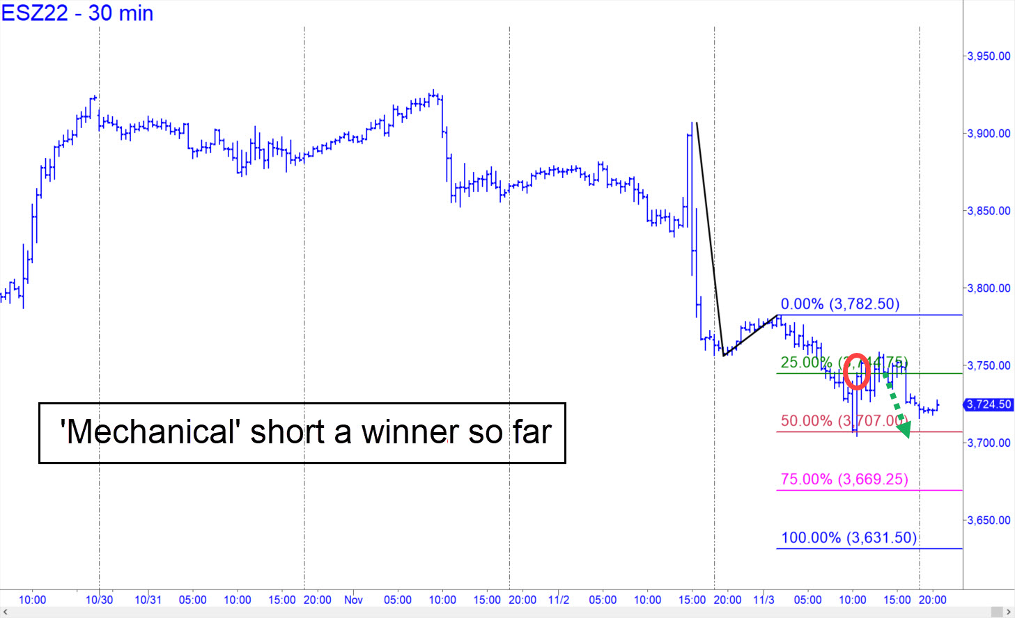 A powerful short squeeze capped the week, daring badly bloodied bears to stand their ground. The rally narrowly exceeded the 3917 target I’d drum-rolled five days earlier, when the futures were trading more than 100 points lower. Some Rick’s Picks subscribers evidently doubled down at the close, betting that the best time to get short is when conditions seem most dangerous. Friday’s close easily passed that test when the futures came to rest a single point shy of an important external peak at 3925.25 recorded September 21 on the way down. If DaBoyz can levitate this gas-bag above that structural resistance Sunday night or Monday, it would refresh the impulsive energy of the hourly chart and put the December contract on track for a finishing stroke to the 4110.75 target of this pattern. You can short there with a tight stop-loss (and at p2=3959.75), but your trading bias should be aggressively bullish otherwise. ______ UPDATE (Nov 2, 4:43 p.m.): This afternoon’s wild swings offered yet another glimpse of the two forces that animate Wall Street: fear and greed. In the context of the larger pattern shown here, the histrionics amounted to just a hiccup, albeit one that would trigger an opportune ‘mechanical’ buy if the futures plummet to x=3653.00, the green line. The $30k of entry risk this implies demands risk-averse tactics for initiating the trade, so stay tuned to the chat room if you care. _____ UPDATE (Nov 3, 8:37 p.m.): Mr Market was providing few clues concerning whether the futures were about to take out today’s low at 3704, presumably bound for the 3653 target flagged above. A breakdown would put them on course for an even lower target at 3631.50 that is shown in this chart. Note also that before ES weakened at the end of the regular session, it triggered a mechanical short at 3744.75 [corrected], the green line. The trade is showing a theoretical profit at the moment of around $1000 per contract, with half of the position to be covered at p=3707.00. If you did the trade on your own initiate, please let me know in the chat room, and I’ll create a tracking position for your further guidance._______ UPDATE (Nov 4, 10:00 a.m.): The short should have been covered at around 3712 using a ‘dynamic’ trailing stop based on the 3711.00 low. Dynamic stop-losses are created by keeping risk:reward in a 1:3 relationship as a price objective is closely approached. The idea behind them is that when a target draws close — say, six points away — you should not allow an adverse swing against you that gives up more than a third (i.e., two points) of what you stood to make. In practice, you can vary the ratio, but it should never be worse than 1:1.