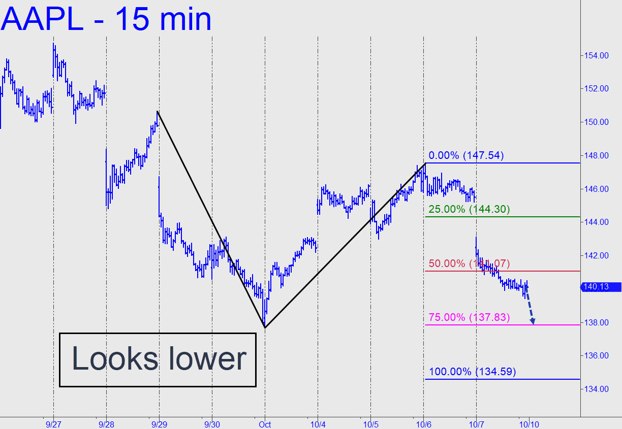 AAPL’s brutal tumble on Friday looked bound at the close for a minimum 137.83, the ‘secondary’ Hidden Pivot in the thumbnail chart. Because this price point coincides with a key low recorded on last Monday’s opening, sellers are unlikely to go for the gusto (i.e., D=134.59) until they’ve experienced a failed rally attempt from p2. A plunge in the first 30 minutes to p2=137.83 should be viewed as a buying opportunity, especially if you can craft a low-risk trigger using a tight rABC pattern with an a-b leg of no m ore than 20 cents. _____ UPDATE (Oct 13, 4:27 p.m.): The 134.59 target drum-rolled above nailed the low of a nearly 7% bounce that is one of the biggest ever for this stock in a single day. Only one subscriber commented on this — he said he made money on the way down — further affirming that subscribers have almost no interest in this stock. I get where you’re at, but I will continue to track AAPL anyway because, as I like to remind you constantly, it is the only stock that matters: Get AAPL right, and you get the stock market right. In fact, you could have made money buying anything today when AAPL was bottoming within 22 cents (i.e., two-tenths of one percent) of the billboarded target. Here’s a snapshot of the Masters of the Universe adding hundreds of billions of dollars to the world’s store of “wealth” by goosing the stock into thin air.