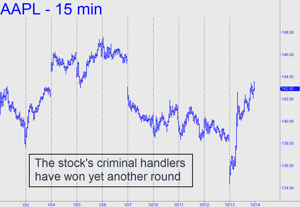 AAPL’s brutal tumble on Friday looked bound at the close for a minimum 137.83, the ‘secondary’ Hidden Pivot in the thumbnail chart. Because this price point coincides with a key low recorded on last Monday’s opening, sellers are unlikely to go for the gusto (i.e., D=134.59) until they’ve experienced a failed rally attempt from p2. A plunge in the first 30 minutes to p2=137.83 should be viewed as a buying opportunity, especially if you can craft a low-risk trigger using a tight rABC pattern with an a-b leg of no m ore than 20 cents. _____ UPDATE (Oct 13, 4:27 p.m.): The 134.59 target drum-rolled above nailed the low of a nearly 7% bounce that is one of the biggest ever for this stock in a single day. Only one subscriber commented on this — he said he made money on the way down — further affirming that subscribers have almost no interest in this stock. I get where you’re at, but I will continue to track AAPL anyway because, as I like to remind you constantly, it is the only stock that matters: Get AAPL right, and you get the stock market right. In fact, you could have made money buying anything today when AAPL was bottoming within 22 cents (i.e., two-tenths of one percent) of the billboarded target. Here’s a snapshot of the Masters of the Universe adding hundreds of billions of dollars to the world’s store of “wealth” by goosing the stock into thin air.