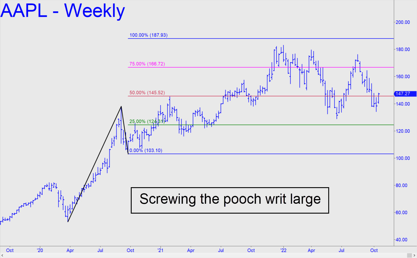I hope you’ll pardon these two atrociously mixed metaphors, but separately they ring true, at least to me: AAPL, having lost one engine, has leveled off at cruising altitude and looks like it is fixing to screw the pooch indefinitely. Ordinarily I would say that the weekly chart (see inset) reflects dithering uncertainty, except that the thieves who routinely and mechanistically rig AAPL’s price action are never without intentions. Thus would it appear they are planning to hold the stock aloft for as long as possible, massaging it within the approximate range 120-175. Distribution will likely intensify above 160; accumulation, below 150.