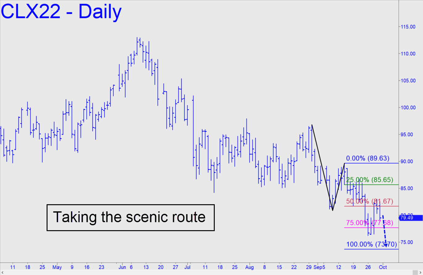 November Crude is taking its time achieving a bearish Hidden Pivot target at 73.70 that has been a month in coming. Upward stabs have been brutal on shorts, making a sell-and-hold strategy impractical and unwise in retrospect. The downtrend has nonetheless triggered two mechanical shorts on feints higher if you count the one at the red line that was signaled last Wednesday. We don’t typically initiate shorts at p, only at x, but this one would have taken a stop-loss at 84.33 if we had. That would have put at risk a third of what we stood to gain if CLX completes the pattern. It is sufficiently gnarly to imply that bottom-fishing at 73.70 with a tight stop-loss would enjoy attractive odds. _____ UPDATE (Oct 3, 6:50 p.m.): Tracking this dervish is mentally depleting, but we’ll still want to paper-trade the ‘mechanical’ short that would trigger if and when it hits X=85.65. I’d rate the trade a ‘5’ — a 50% chance to profit, and therefore not very enticing.