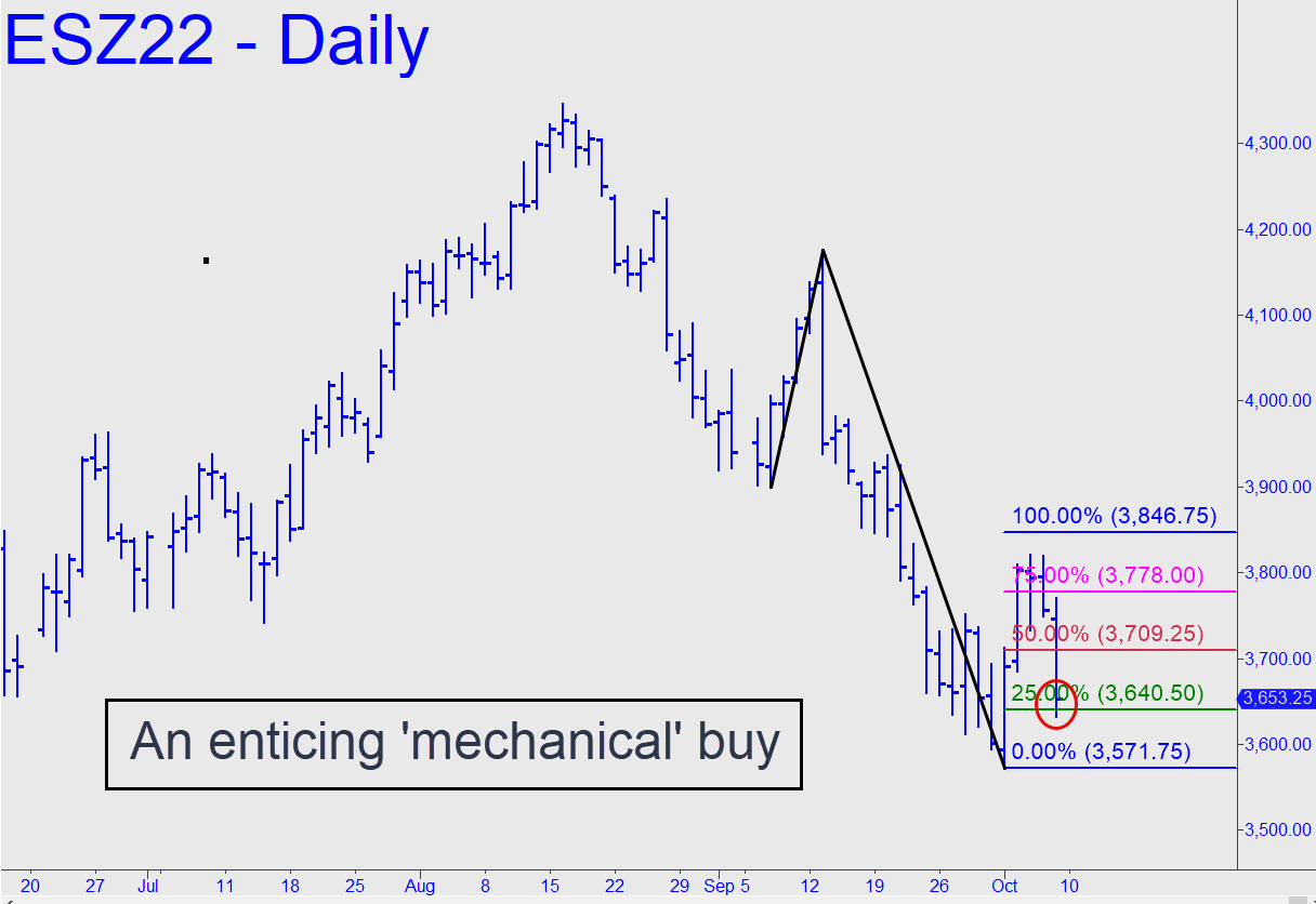 Friday’s refreshing death dive may have felt like the start of something big, but the chart suggests we’d probably have been buyers at the close. The 106-point selloff hit the green line after topping midway between p2 and D, generating a classic ‘mechanical’ buy signal that we’ve seen work again and again. This is not to say the rally we can expect on Monday will necessarily reach D=3846.75, only that getting long at the green line (stop 3571.75) would probably have been a good bet for at least a one-level ride to p=3709.25. That’s a nearly $14,000 opportunity, but we passed it up because staking out a position in the final hour of a Friday is courting trouble and not how we roll. ______ UPDATE (Oct 10, 11:06 p.m.): Although the ‘mechanical’ buy at 3640.50 (stop 3571.50) remains nominally alive, today’s dirge killed my interest in the trade early in the session. (See my post at 12:50.) For their part, sellers did nothing to brag about. They will win on Tuesday, though, unless DaBoyz can gin up some “news” to trigger off a short squeeze. ______ UPDATE (Oct 13, 5:05 p.m.): Use this pattern to make tradable sense of today’s lunatic bounce, an affront and disgrace to civilization itself. Although there is little meaning to any statistical news we read these days, traders evidently feel obliged to go nuts with it, even if no one can say whether the news will prove bullish or bearish. Today they interpreted it both ways by turns, but don’t expect the psychotic rally that ended the day to get very far, even if it exceeds D=3750.25 (corrected) in an ultimately doomed attempt to fool patient bears.