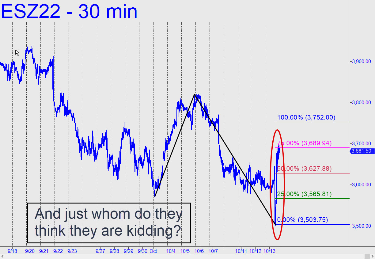 Friday’s refreshing death dive may have felt like the start of something big, but the chart suggests we’d probably have been buyers at the close. The 106-point selloff hit the green line after topping midway between p2 and D, generating a classic ‘mechanical’ buy signal that we’ve seen work again and again. This is not to say the rally we can expect on Monday will necessarily reach D=3846.75, only that getting long at the green line (stop 3571.75) would probably have been a good bet for at least a one-level ride to p=3709.25. That’s a nearly $14,000 opportunity, but we passed it up because staking out a position in the final hour of a Friday is courting trouble and not how we roll. ______ UPDATE (Oct 10, 11:06 p.m.): Although the ‘mechanical’ buy at 3640.50 (stop 3571.50) remains nominally alive, today’s dirge killed my interest in the trade early in the session. (See my post at 12:50.) For their part, sellers did nothing to brag about. They will win on Tuesday, though, unless DaBoyz can gin up some “news” to trigger off a short squeeze. ______ UPDATE (Oct 13, 5:05 p.m.): Use this pattern to make tradable sense of today’s lunatic bounce, an affront and disgrace to civilization itself. Although there is little meaning to any statistical news we read these days, traders evidently feel obliged to go nuts with it, even if no one can say whether the news will prove bullish or bearish. Today they interpreted it both ways by turns, but don’t expect the psychotic rally that ended the day to get very far, even if it exceeds D=3750.25 (corrected) in an ultimately doomed attempt to fool patient bears.