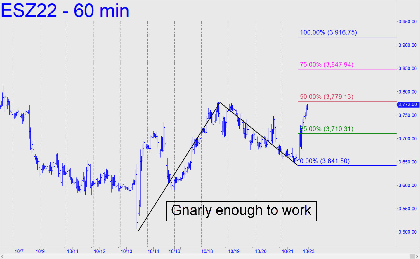 The bullish pattern shown is gnarly enough to work, whether you are trying to nail a short-term top, forecast intraday swings or bottom-fish on pullbacks. It also assumes that the vicious short squeeze in progress at the closing bell on Friday will carry into the new week. That’s hardly a given, considering the balky behavior and arrested trends in both directions that have characterized the market during the last couple of months. You can confidently infer that a follow-through to D=3916.75.75 impends if short-covering bears demolish the p=3779.13 resistance Sunday evening. A one-level pullback thereafter can be used to get long via a ‘mechanical’ bid, provided you thoroughly understand such set-ups. _______ UPDATE (Oct 24, 9:33 a.m.): Greed got the better of the night shift last night, as it nearly always does, although price action was much nuttier than usual for a Sunday night. It began with a single-bar head-fake on the opening, but it was downhill for the next ten hours. A so-far timid climb began at 5:00 a.m., with predictably low participation. However, all of this did not alter the bullish target, which I am adjusting slightly higher, to 3917.50, nor did it affect the usefulness of the pattern. A one-level pullback will still set up a ‘mechanical’ buy with a good chance of generating a profit. The overnight low at 3736.50 failed to do this — i.e., missed the green line (3711.06) — by 25 points, but a ‘sloppy seconds’ entry remains viable. Here’s a visual summary. _______ UPDATE (Oct 27, 6:07 p.m.): It is bearish that ES missed my 3916 rally target by 20 points, or 0.5%, but remarkable nonetheless that it is holding up fairly well amidst today’s FAANG carnage. ES has recouped half of the engineered, after-the-bell downdraft. This is pure distribution sleaze, but it is coordinated with the even more amazing swoon in AAPL. AAPL is so effectively targeted on short-squeeze opportunities that it is setting up a squeeze on the entire stock market. This afternoon’s two-minute dive from $145 to $136 and then back up to $145 is thumbing its nose at the earnings-news-obsessed maniacs with the taunt “Is that the worst you can do?”