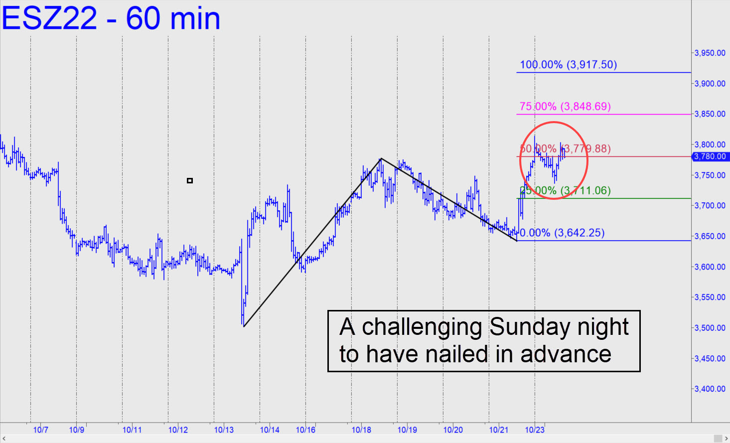 The bullish pattern shown is gnarly enough to work, whether you are trying to nail a short-term top, forecast intraday swings or bottom-fish on pullbacks. It also assumes that the vicious short squeeze in progress at the closing bell on Friday will carry into the new week. That’s hardly a given, considering the balky behavior and arrested trends in both directions that have characterized the market during the last couple of months. You can confidently infer that a follow-through to D=3916.75.75 impends if short-covering bears demolish the p=3779.13 resistance Sunday evening. A one-level pullback thereafter can be used to get long via a ‘mechanical’ bid, provided you thoroughly understand such set-ups. _______ UPDATE (Oct 24, 9:33 a.m.): Greed got the better of the night shift last night, as it nearly always does, although price action was much nuttier than usual for a Sunday night. It began with a single-bar head-fake on the opening, but it was downhill for the next ten hours. A so-far timid climb began at 5:00 a.m., with predictably low participation. However, all of this did not alter the bullish target, which I am adjusting slightly higher, to 3917.50, nor did it affect the usefulness of the pattern. A one-level pullback will still set up a ‘mechanical’ buy with a good chance of generating a profit. The overnight low at 3736.50 failed to do this — i.e., missed the green line (3711.06) — by 25 points, but a ‘sloppy seconds’ entry remains viable. Here’s a visual summary. _______ UPDATE (Oct 27, 6:07 p.m.): It is bearish that ES missed my 3916 rally target by 20 points, or 0.5%, but remarkable nonetheless that it is holding up fairly well amidst today’s FAANG carnage. ES has recouped half of the engineered, after-the-bell downdraft. This is pure distribution sleaze, but it is coordinated with the even more amazing swoon in AAPL. AAPL is so effectively targeted on short-squeeze opportunities that it is setting up a squeeze on the entire stock market. This afternoon’s two-minute dive from $145 to $136 and then back up to $145 is thumbing its nose at the earnings-news-obsessed maniacs with the taunt “Is that the worst you can do?”