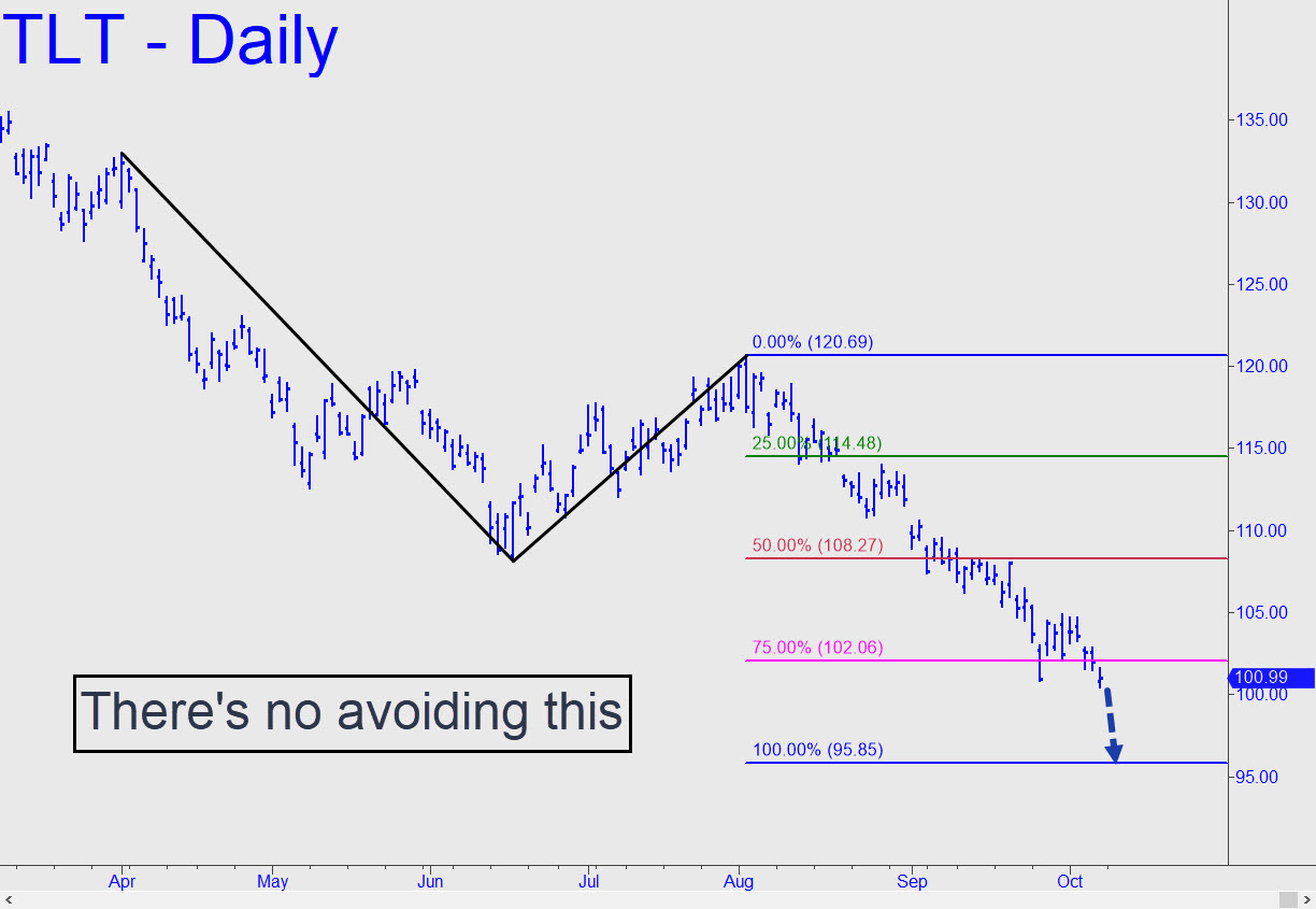 TLT, an ETF proxy for the long bond, is headed down to at least 95.85, a 5% fall from these levels. That would imply that rates on the 30-year are about to rise from a current 3.84% to 3.91%. However, my long-term forecast calls for a 5% rate on the Long Bond and 4.9% on the Note, so TLT presumably has a long way to before it hits bottom. Most immediately, though, look for more slippage to the 97.72 target shown in this chart. It is all but certain to be hit, but it can also be used to bottom-fish with a tight rABC trigger. _____ UPDATE (Oct 18, 8:52 p.m.): TLT’s dip beneath the 97.72 target precipitated an outpouring of interest in the chat room that I would never have imagined existed. This latest show of weakness has not much depleted our supply of downside targets, the next of which lies at 95.85 (as noted above). That Hidden Pivot support isn’t likely to last long either, since rates on the 30-Year have a long way to go before they reach my target at 4.9%.