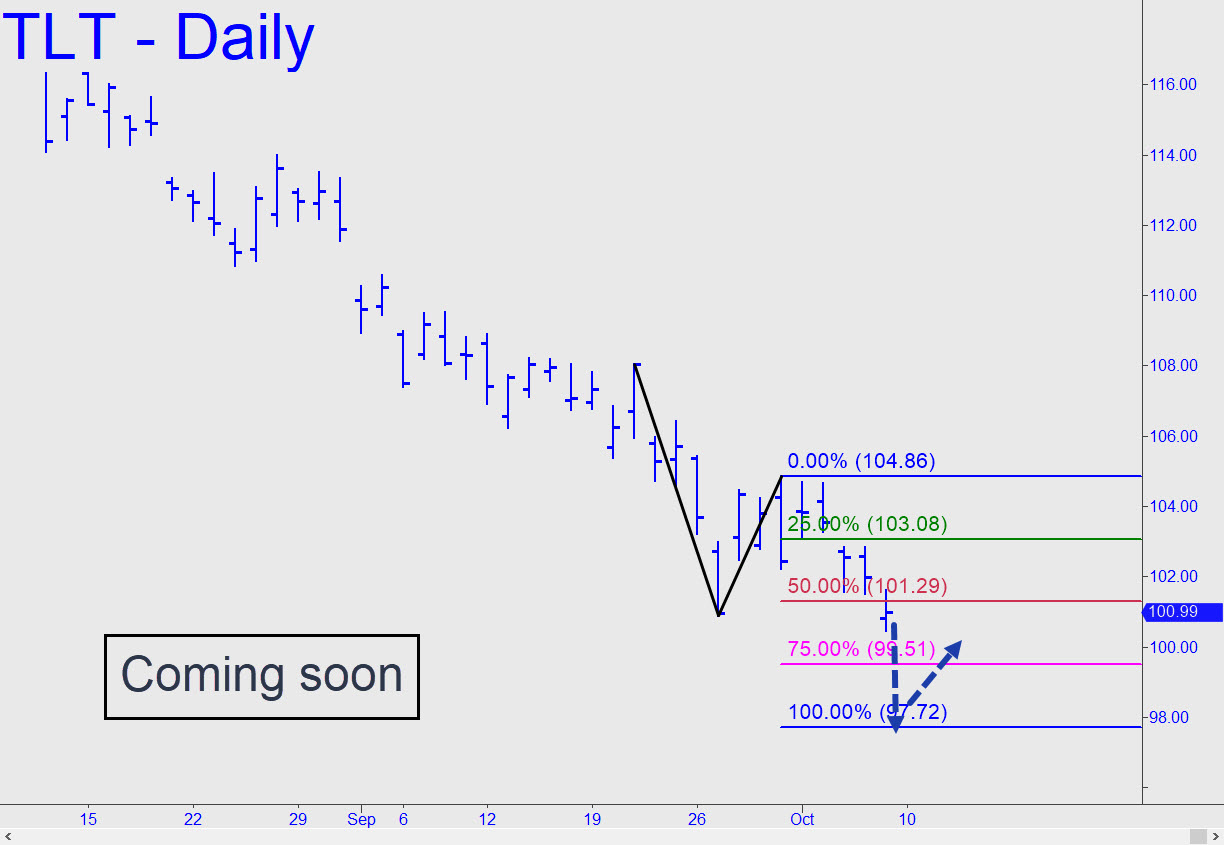 TLT, an ETF proxy for the long bond, is headed down to at least 95.85, a 5% fall from these levels. That would imply that rates on the 30-year are about to rise from a current 3.84% to 3.91%. However, my long-term forecast calls for a 5% rate on the Long Bond and 4.9% on the Note, so TLT presumably has a long way to before it hits bottom. Most immediately, though, look for more slippage to the 97.72 target shown in this chart. It is all but certain to be hit, but it can also be used to bottom-fish with a tight rABC trigger. _____ UPDATE (Oct 18, 8:52 p.m.): TLT’s dip beneath the 97.72 target precipitated an outpouring of interest in the chat room that I would never have imagined existed. This latest show of weakness has not much depleted our supply of downside targets, the next of which lies at 95.85 (as noted above). That Hidden Pivot support isn’t likely to last long either, since rates on the 30-Year have a long way to go before they reach my target at 4.9%.