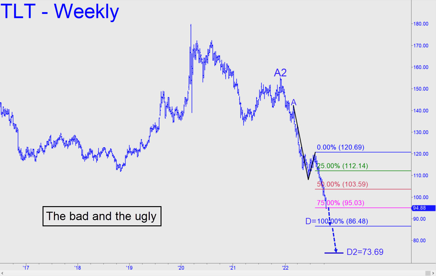 TLT’s decisive breach of the 97.19 midpoint support earlier this week (see inset) implies it will continue falling to at least 86.48, or perhaps even to 73.69 if that secondary Hidden Pivot support fails. These numbers correspond on the weekly chart to 30-Year interest rates of, respectively, 4.20% (achieved today, presumably slightly out-of-synch with TLT) and 4.65%. That last number, my worst case, is lower than the 4.90% I’d estimated earlier, but it appears to be a good target for a potential top. _______ UPDATE (Oct 24, 4:32 p.m.): I hadn’t noticed this pattern earlier, but it is mildly promising for a temporary bottom at D=91.77. This Hidden Pivot target was effectively fulfilled with today’s 91.85 low, but there was little to encourage in the so-far weak bounce that has followed. The pattern was confirmed by the precise bounce from p=98.32 which would have made today’s price action worth bottom-fishing.