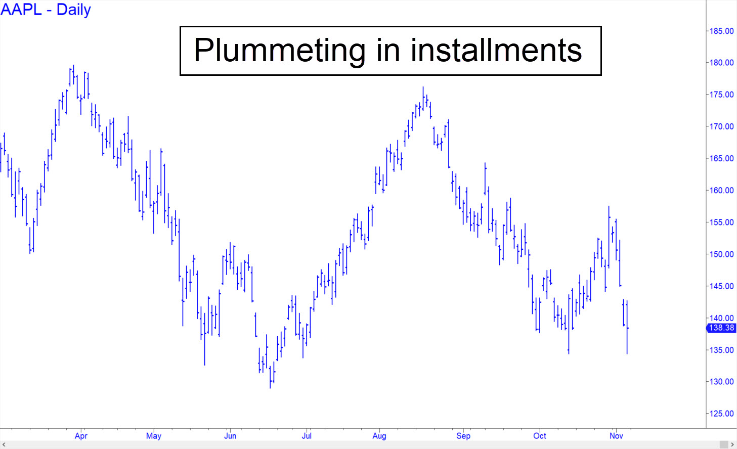 As forecast, AAPL has plunged into the mid-$130s, The prediction was unrelated to Hidden Pivot targets, but rather to the likelihood that there will be many visually compelling stops along the way down to $50 or lower. That’s where I see the stock headed, an outlook that I started drum-rolling months ago when the company bragged about how well sales were holding up. One of iPhone’s key markets, Europe, was already in the throes of a slowdown that threatens to be far worse than a garden-variety recession. At the same time, China was starting to slip into an abyss of its own, with the U.S. economy presumably not far behind. Under the circumstances, the shares of Apple, whose revenues come mainly from sales of the relatively pricey iPhone, have nowhere to go but down. Considering the company’s size, it is arguably the most vulnerable consumer goods company in the world with recession bearing down on us. From a technical standpoint, I expect the stock to bounce from one of my ‘voodoo numbers’ before falling to test last June’s $129 low. I’ll say nothing more about this, however, unless there is very strong interest in the chat room. Let me remind you nevertheless: As AAPL goes, so goes the stock market. Get the stock exactly right and you will get the bear market exactly right. _______ UPDATE (Nov 9, 6:43 p.m.): Bears have been struggling to crush this once-might stock, which is still capable of intimidating with doomed rallies. A test of mid-June’s low at 129.04 seems so obvious that I have not prepared a chart with Hidden Pivot levels to target the downtrend. Another reason is that the little p.o.s. has a habit of leaving sausage ‘B’ lows to terrorize and bamboozle erstwhile bottom-fishers. Such lows diminish the accuracy and reliability of Hidden Pivot patterns. Here’s a chart that shows the big picture. _______ UPDATE (Nov 10, 6:59 p.m.): I’ve set an alert at 158.75, a tick above the Sep 21 ‘external’ peak, to warn me if and when bulls have taken charge, even if only temporarily.