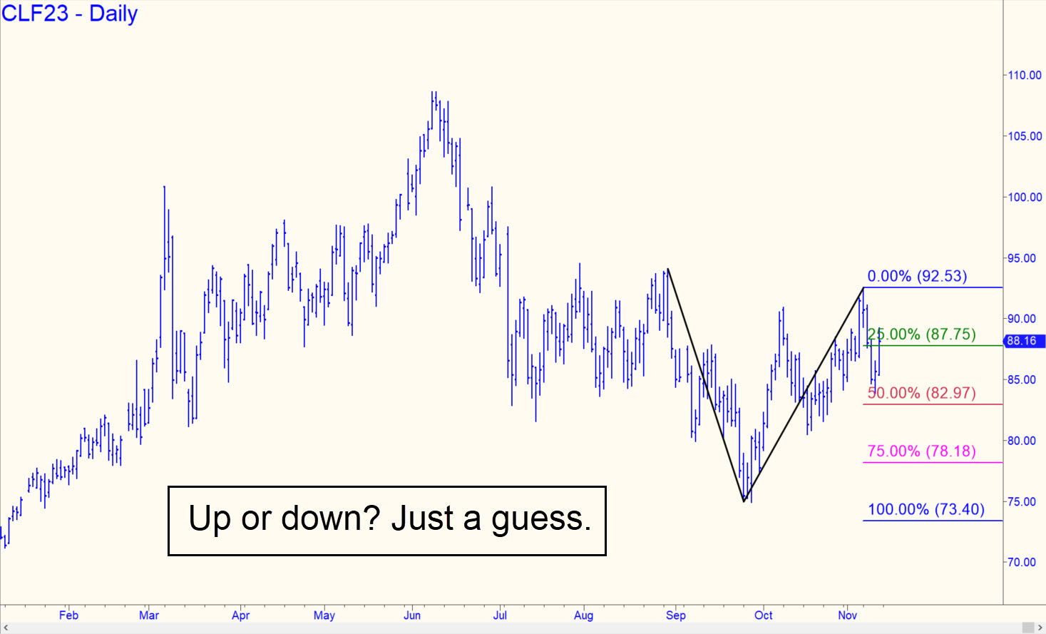 Crude has spent so much time churning in the mid-to-high 80s since March that one might as well flip a coin to guess where it’s going next. Presumably nowhere, or at least not far, but we tend not to short that outlook too aggressively, since crude is legendary for taking a story and running with it — in either direction. My coin-toss produced a mildly bearish chart that, regardless of price action in the week ahead, can serve as a framework for trading. It is neutral at the moment, having failed to reach p=82.97, an enticing spot for bottom-fishing. Nor did Friday’s upthrust to the green line trigger a ‘mechanical’ short, since it came off a low above p=82.97.