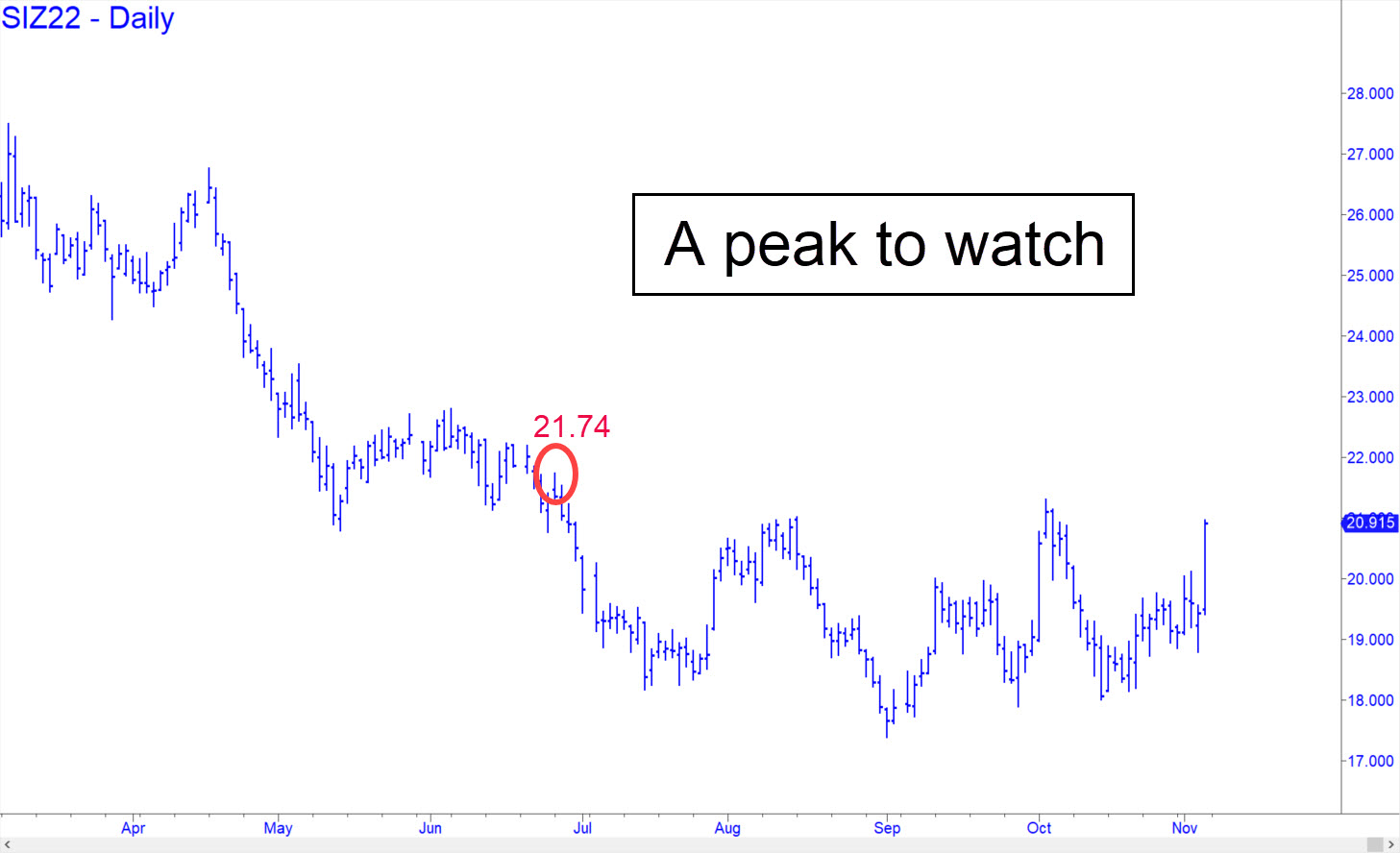 Friday’s blitzkrieg rally capped a whole month of gingerly stair-stepping. Would you believe that all of it did not push the futures past a single ‘external’ peak on the daily chart, let alone generate an impulse leg? The good news is that it would require a further push of just 82 cents to create a quite promising one. The chart (see inset) clarifies this with a peak I’ve circled at 21.74 that was recorded at the end of June. It may not look like much, but it is as significant technically as most of the more obvious peaks on the chart. I’ve set an alert there, and bulls should take heart if it gets triggered this week (the earlier the better). _______ UPDATE (Nov 10, 8:33 p.m.): The futures topped almost exactly at the 21.90 target I posted in the chat room at 8:44 a.m., so they are due for a rest. However, the subsequent pullback has been shallow so far, implying bulls are still revved up. They will have their work cut out for them trying to make headway over the next few days, though, since the uptrend has entered a thick band of supply deposited last spring between 21.72 and 22.76 (corrected) . We’ll be better able to judge the staying power of the rally once we’ve seen how it fares ‘in the zone’.