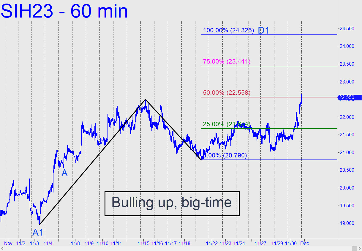 The December contract exceeded my minimum expectation last week at 21.50, so I’ve selected a more ambitious rally pattern with a 22.40 target to keep us a step ahead of the herd if Silver continues to rise as expected. A pullback to the green line (x=21.05) would trigger a ‘mechanical’ buy, but the balky A-B leg argues against trying to get long with a conventional bid and a 20.59 stop-loss. Camouflage may be the ticket, so stay tuned to that chat room if you’re interested. _______ UPDATE (Nov 28, 10:03 p.m.): The futures took a $1200 bounce from within a half-cent of the green line, enabling at least one subscriber to report a quick profit in the chat room. Silver’s subsequent relapse has muddied the immediate picture and left me with nothing exciting to recommend for today. My ‘voodoo number’ for a possible turn would be 20.98 — worth risking no more than 2-3 cents on a stop. _______ UPDATE (Nov 30, 7:12 p.m.): A bullish pattern going back to early November would be superseded by a larger one if this rally decisively exceeds 22.73, basis the March contract, or closes above it for two consecutive days. The new target, a clear and compelling Hidden Pivot resistance, would be at 24.325, shown in this chart.