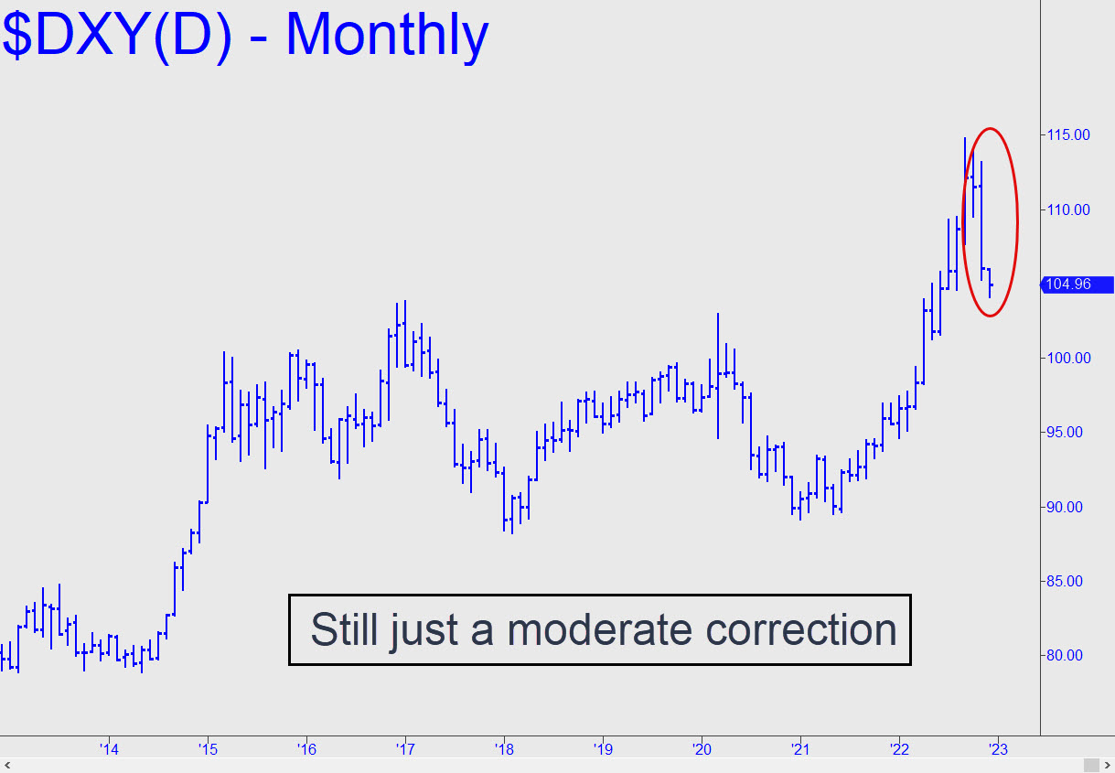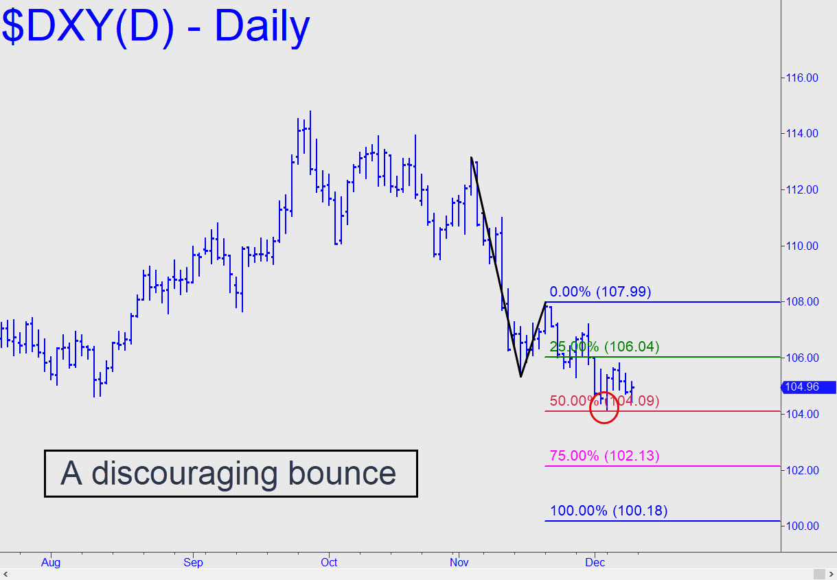 The dollar’s weak bounce from p=104.09 implies that still lower prices are likely. Considering that the midpoint pivot lies just beneath a key low at 104.64 recorded back in August, the rally should have been stronger, since many bulls would have been stopped out when the breakdown occurred. We’ll monitor the expected breach of the 104.09 Hidden Pivot, since, if it gets crushed, that would portend more slippage to as low as D=100.18. That would represent a still-moderate 12% correction from September’s 114.78 high — not too bad considering the steepness of the rally that saw the Dollar Index rise from 89.21 to 114.78 between early 2021 and October 2022.