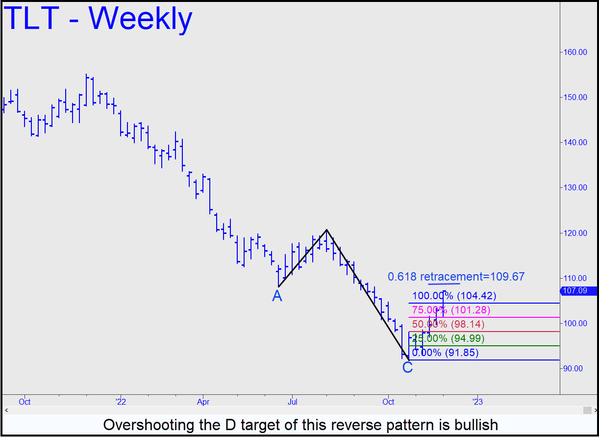 The bull trend begun in late October showed signs of getting legs when it closed above the 104.42 D target of the reverse pattern shown. There are no immediate external peaks nearby that we could use to gauge the rally’s strength, but we’ll continue to monitor its temperature nonetheless using other benchmarks such as the 0.618 Fibonacci retracement level that would equate to a price of 109.67. An easy move through it would signify that buying power has not abated as the rally has progressed. ______ UPDATE (Dec 8, 9:27 p.m.): TLT has pulled back only slightly after topping on Wednesday a penny above the 109.67 Fibo line we were using as a minimum upside objective. It looks like it wants to run higher, but let’s wait and see.