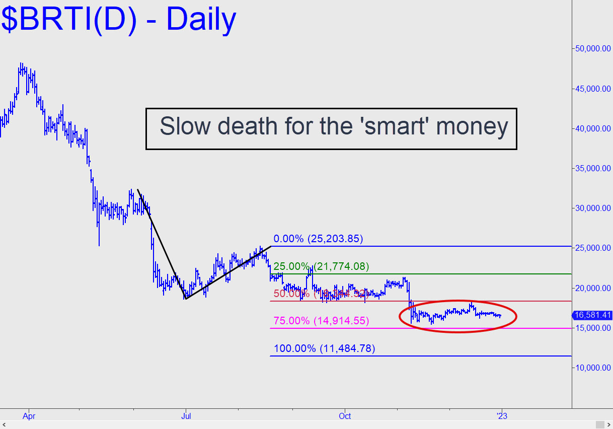 The chart shows what can happen when the so-called smart money gets trapped. Given the unnaturally tight trading range that bitcoin’s deft conspirators have maintained for nearly two months, one might believe they are capable of holding the cryptocurrency above $15,000 indefinitely. Unfortunately for them, the chart is telegraphing a fall to at least 11,484. Bitcoin’s deep-pocketed sponsors undoubtedly have been hoping to be rescued by a powerful short-squeeze, but this is looking increasingly unlikely to materialize from these levels. As ‘Trader Mike’ Schurr likes to remind us in the chat room, hope is not a strategy. The smart guys will have a better chance of propagating a short-covering panic if they allow more slippage, however painful, to the 11,484 Hidden Pivot. Even then, the reaction move would be limited by mountainous supply above $25,000 from players whose cost basis is at least twice that. More likely, in the context of an intensifying bear market in stocks that could run for years, is a washout that threatens to take bitcoin down to $5000 or lower. ______ UPDATE (Jan 9, 5:43 p.m.): Today’s volumeless waft just missed touching an important midpoint Hidden Pivot at 17,456. Buyers will need to pulverize it, however, to demonstrate their seriousness and ability to reach D=18,634. _______ UPDATE (Jan 12, 11:39 p.m.): Bertie’s doomed rally topped in an obvious spot, at the 19157 D target of this pattern, It is into serious supply now, so we shouldn’t expect today’s Whoopee Cushion squeeze to continue much higher.
