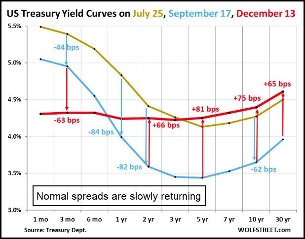 My proprietary model turned negative in June for four consecutive weeks. Usually, the model issues one or two signals before a major market change occurs. But never have there been six signals in one year, as has just occurred. What was missing earlier was that the yield curve was inverted and had been that way for nearly two years, the longest inversion ever. Since then, it has begun to normalize, with longer-term rates slowly rising above shorter-term. (See graph above, from WolfStreet.com.) The process has further to go before the spreads widen to historical norms. However, markets have a tendency to fall apart not when the yield curve inverts, but when it starts returning to normal. That is why I have interpreted my data somewhat more bearishly than I might have otherwise.