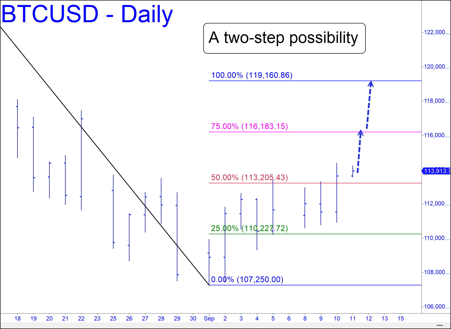 Bitcoin’s bounce two weeks ago from within a hair of a correction target at 107,064 has gotten legs and now promises more upside over the near term to as high as 119,160. Bulls have all but clinched a move to at least 116,183, the ‘secondary’ Hidden Pivot resistance (p2) of the pattern shown. However, a follow-through to D=119,160 is not a done deal yet and would be predicated on a decisive penetration of 116,183 on first contact. Meanwhile, a relapse to 110,272 (x, the green line) can be bought with a 107,249 stop-loss. ______ UPDATE (Sep 12, 2:01 p.m. EDT): Bulls have popped this gas-bag to 116,365 this morning. That’s 0.15 percent higher than my minimum target, but not quite enough to guarantee that D=119,160 will be achieved. I expect this to happen, but the yellow flag is out anyway just to be extra cautious. _______ UPDATE (Sep 20): No change, although I’ll suggest shorting the 119,160 target with tight risk-control., since I strongly doubt BTC will take it out without a see-saw battle. If it does, it would be signaling more upside to at least 126,622, or 132,996 if any higher. _______ UPDATE (Sep 22): Bitcoin’s meaningless histrionics have not altered my rally target, although I will: with a small upward adjustment to 119,740. Meanwhile, the current correction looks bound for at least 110,435, but a breach of that Hidden Pivot support could send bulls down to as low as 107,894 in search of traction. ________ UPDATE Oct 2, 2:41 a.m.): The little hoax rallied to within 0.2% of my target, close enough for us to consider it precisely fulfilled. Anyone care to know exactly where it is going next? I saw a ZeroHedge article about a supposed double-top in this vehicle, but I’m guessing it was written by a Starbucks barista moonlighting as a chartist.