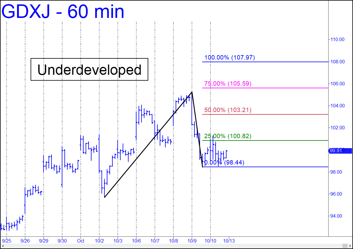 GDXJ’s ballistic rally died midway between two middling targets at 104.25 and 106.84, respectively. A more important one lies at 111.59, and we are using it as a bull-market objective with the potential to stop buyers in their tracks. More immediately, you can play for a run-up to the 107.96 target shown in the inset. The pattern has yet to develop, since a ‘buy’ signal at the green line gave way to weakness on Friday that nearly stopped out the trade. We’ll give bulls the benefit of the doubt for the moment nevertheless, implying p=103.21 can be used as a minimum upside objective when shares start to trade on Monday. If they fall on their face at the starting bell, slide ‘C’ down to the new low to create a fresh, usable pattern, even if it is beneath the current ‘C’ at 95.71 (10/2).