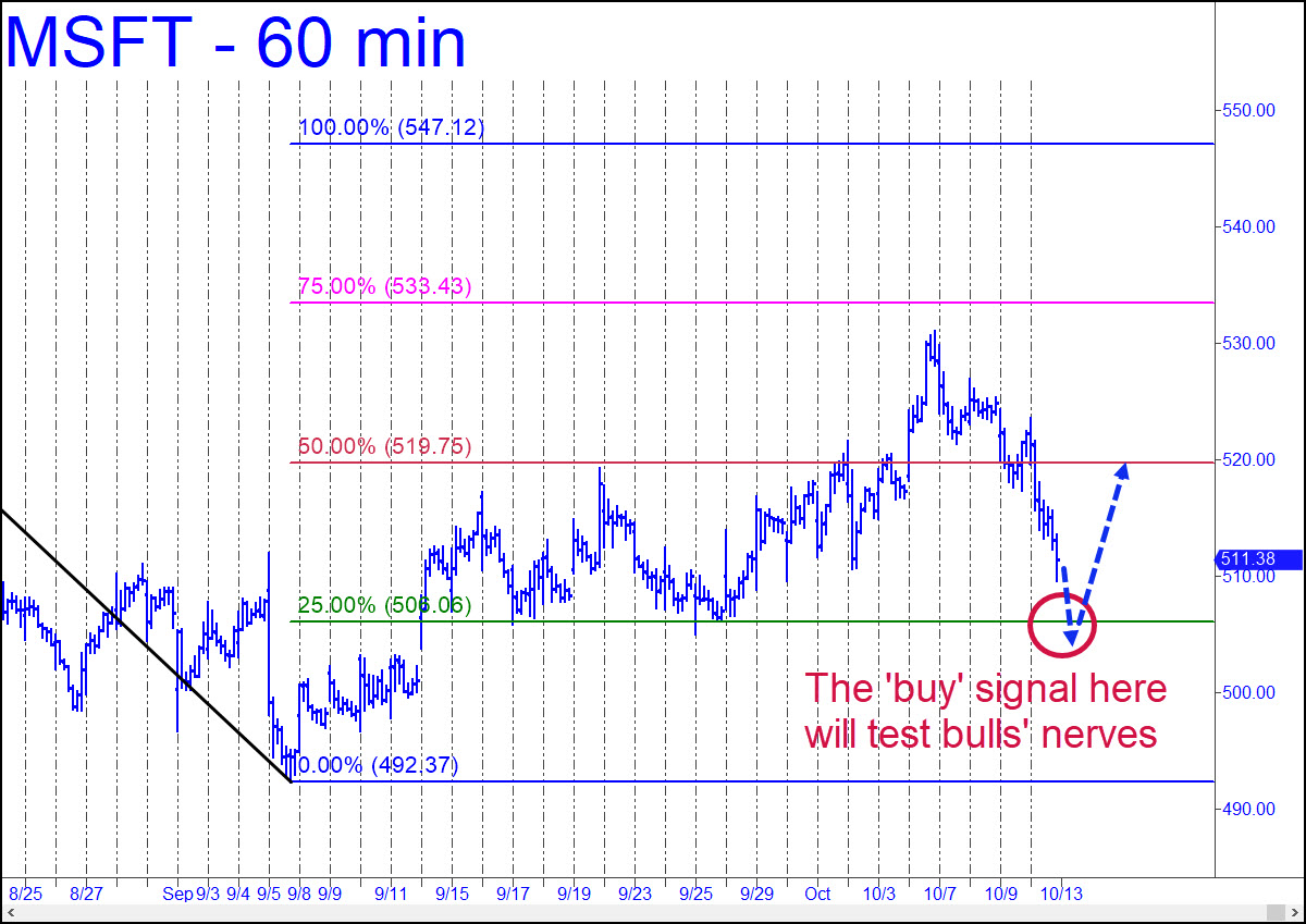 I’ve put MSFT at the top of the list because it is about to provide the clearest test of whether a bear market has in fact begun. No matter how bearish one’s outlook is for the stock market following Friday’s stunning reversal, MSFT would trigger an irresistible ‘mechanical’ buy signal if it touches the green line (x=506.06), as seems likely. That doesn’t necessarily mean the implied bounce will achieve d=547.12, effectively reviving the bull market. More likely in my estimation is that a weak bounce will carries no higher than p=519.75, the midpoint Hidden Pivot. Whatever happens, the second most valuable company in the world cannot but reveal the health of the bull market, or lack thereof.