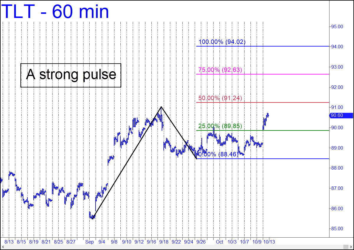 T-Bonds got a strong lift from Friday’s panicky sell-off on Wall Street. TLT became a good bet to reach p=91.24, at least, but a decisive move through this Hidden Pivot, especially on first contact, would imply more upside to p2=92.63, and thence to as high as D=94.02 over the near term. Although the pattern is a conventional one with a ‘C’ low above ‘A’, it is sufficiently compelling to lend authority to the bullish case. Assuming D is achieved, look for stocks to continue lower, with hard selling in the institutionally driven lunatic sector (a.k.a. the ‘Magnificent Seven’) and in Bitcoin.