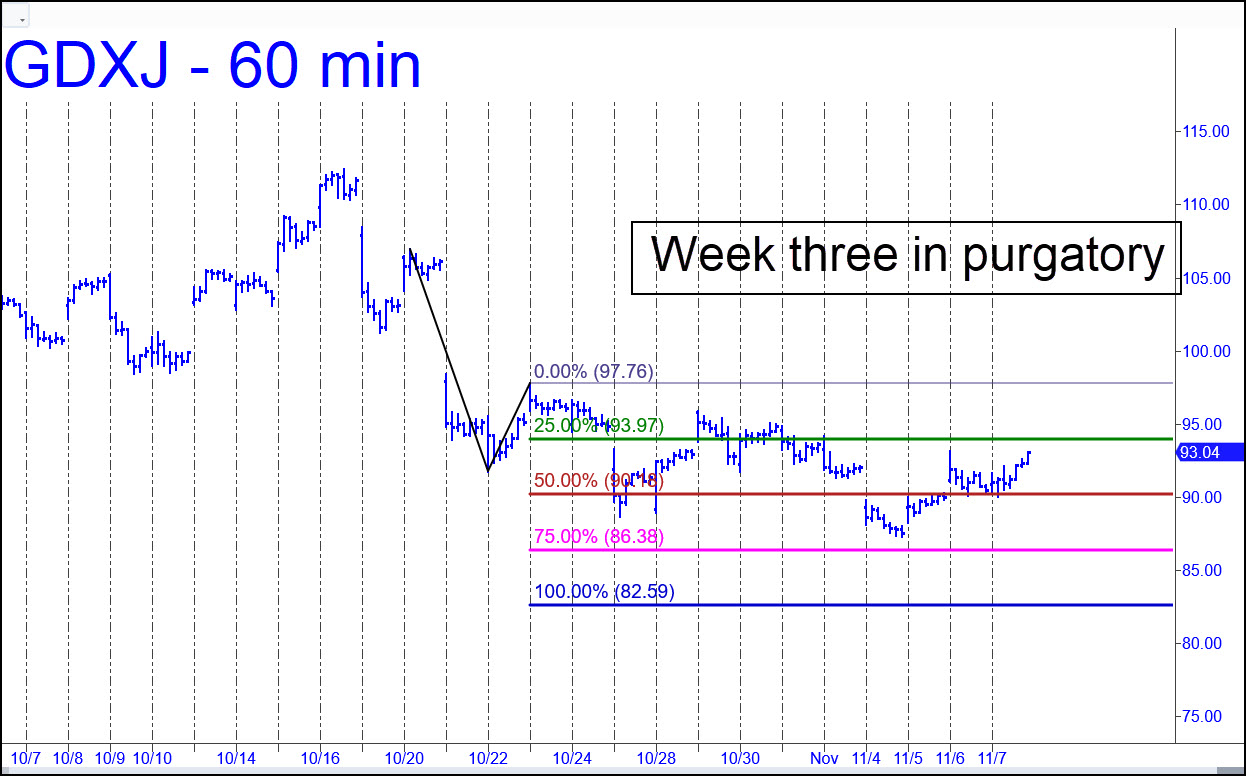 GDXJ entered its third week in purgatory, unable to attract the buying power to wreck the corrective pattern shown. That would take a push above the pattern’s point ‘C’ high at 97.76. Sellers evidently were equally spent after failing to reach the secondary Hidden Pivot support, p2=86.38. My hunch is that bulls eventually will prevail, but there’s not much to entice unless you’re a scalper. The turgid price action reflects similar indecisiveness in bullion futures, which have lacked direction since completing a 350-point selloff on October 22.