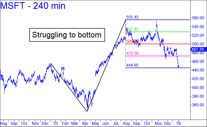 Although the trend has been bearish since the stock at peaked at 555.45 in July, bears have struggled lately to achieve the implied correction target at 444.95. Most immediately, I expect the stock to run up to the 496.09 target of a minor pattern, If it takes out the pattern’s ‘C’ low at 482.09 (12/19) first, however, I’d consider the possibility that stocks are in a bear market more seriously. Because of its solid revenue stream and its pre-eminence in the lunatic sector (aka the Magnificent Seven), Microsoft remains my #1 bellwether for the 16-year-old bull market.