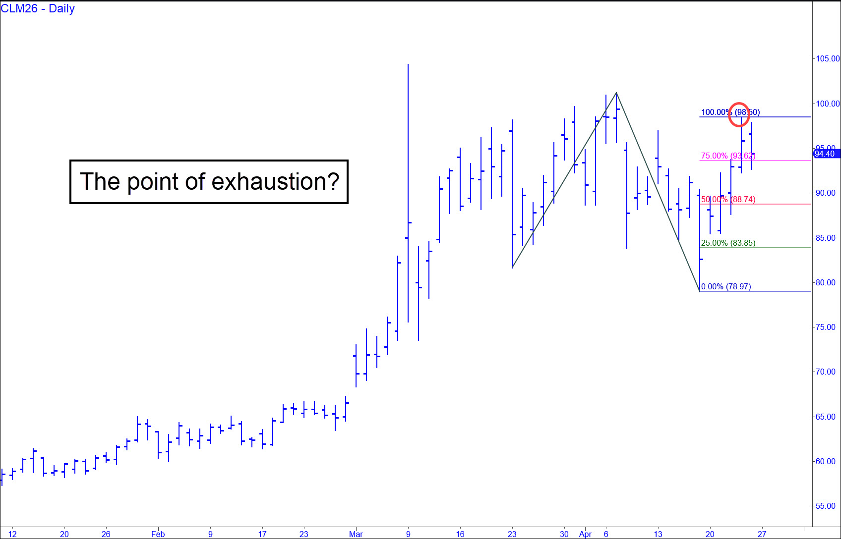 The potentially important low I signaled a week ago caught the exact bottom of a powerful, $20 rally. It came within 11 cents of the 98.50 target for the June contract, then receded by nearly $6 to finish the week. Are bulls depleted? We may know soon, since, with moderate selling to start the new week, the retracement will test the 89.41 midpoint Hidden Pivot support of a reverse pattern on the daily chart (a= 96.93 on 4/13). It should hold if Crude is going to challenge the spike high at 104.34 recorded on March 9. Otherwise, a decisive breach of p would open a path down to at least 80.43. This analysis should prove as accurate as the one proffered last week, since the patterns on the chart are equally compelling.