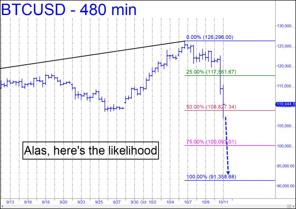 Hey, I’m only the messenger, but this bloated sack of horse manure is headed down to at least 91,358. That would represent a 28% plunge from the all-time high at 126,296 recorded less than a week ago. Although that’s probably not enough to scare out the dolts who bid it
