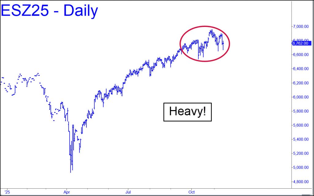 You can feel the ponderous weight of supply in the daily chart (see inset). Although the pattern lacks the symmetry of a textbook head-and-shoulders formation, there are enough similarities to infer that bulls are headed for a fall. Friday’s nasty bounce, a short-squeeze assisted by an army of by-the-dip dipsticks,