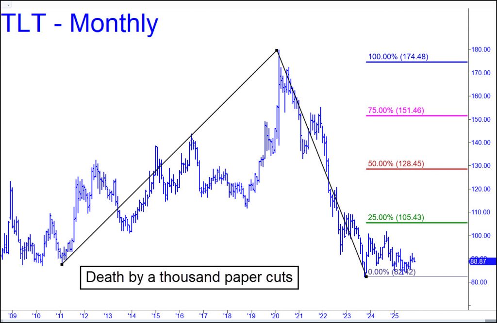 My hardcore deflationist point of view has saddled me with a bullish bias whenever I ponder a T-bond chart. Although this allowed me to catch the October 2023 bottom just off the low, it also caused me to see the nearly two-year dirge that has occurred since as base-building for