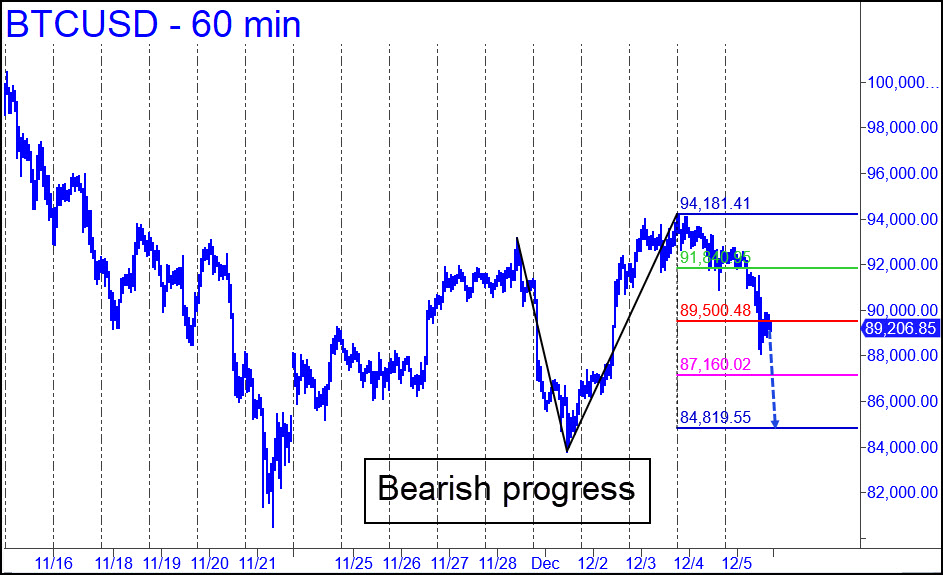 Although Bitcoin ended the week in a mild selloff, it occurred in the context of a bullish cycle begun two weeks ago from 80,526. The correction would need to hit d=84,819 to set up an attractive buy, and a run-up in the meantime to x=91,840 would trigger a ‘mechanical’ short.