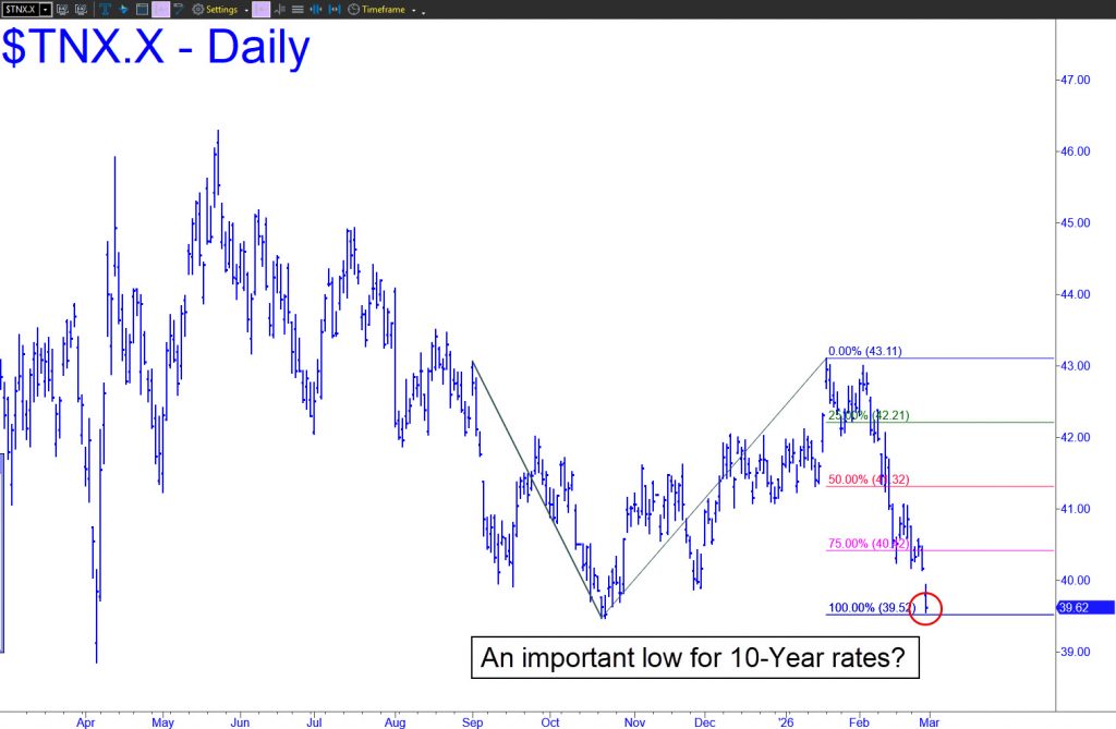 Rates on the 10-Year Note came within a hair on Friday of lows not seen since October. My suggestion is to enjoy it while it lasts, since the intraday bottom closely coincided with a Hidden Pivot target at 3.952%. The actual low was  3.956%, which was near enough to consider