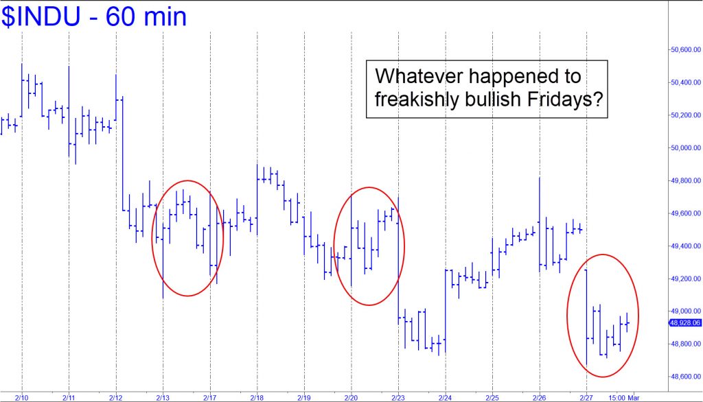 Under the circumstances, an exuberant leap to new highs seems most unlikely for the broad averages. The Dow Industrials have eased somewhat after head-butting 50,000 for a few days. DaBoyz are waiting for a news catalyst to drive a short-covering panic. This is the primary force powering all big rallies, the only source of buying strong enough to push stocks past previous peaks and thick layers of supply. If your imagination tells you what bullish news will cause this to happen, then you should be buying stocks hand-over-fist now, not even waiting for a significant dip. I must confess, however, that I am out of ideas.  There are plenty of things that could go wrong, though, and the interview I did Friday on This Week in Money discusses them in detail. Click here to access it.