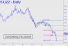 Although we should always be alert to the possibility of a turn from the secondary pivot (p2), in this case it seems unlikely. Once September Silver penetrated p=19.59 decisively, it never looked back. The futures seem to have eyes for the 16.53 target we've been using, and this is corroborated by a corresponding one in August Gold at 1665. A tradeable turn from near 16.53 if it is reached is all but a lock-up, but as I've mentioned in the latest gold update, the pattern looks too obvious to deliver a low we can count on to be precise.
