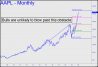 The 314.28 target drum-rolled here earlier looks like a logical spot for the rally to fail. However, if buyers should exceed it intraday by more than 0.30 or so -- or better yet, close above it -- use the 319.92 target shown in the monthly chart (inset) as a minimum price objective. Both of these hidden Pivot resistances are sufficiently clear and compelling that I'll be surprised if AAPL ignores them. A small speculative position in sub-$1 puts with 7-12 days left on them would be appropriate at either number, but don't risk more than you can afford to lose painlessly. If they double in value, cash out half and save the rest. _______ UPDATE (Jan 13, 2:36 p.m. EST): With a high so far today at 314.90, AAPL has traded sufficiently above the 314.28 target that I'm shifting my focus -- and the possibility of getting short -- to the 319.92 target. [Late-breaking note: AAPL eventually traded as high as 317.07. Plan B remains viable.] _______ UPDATE (Jan 14, 9:59 p.m.): The stock climbed to 318.80 overnight but fell too sharply by the opening to allow us to squeeze off a shot. The off-hours high may turn out to have been the important top we'd anticipated, but since the trade was nearly impossible to have executed satisfactorily, I am not establishing a tracking position.