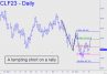 Crude's fright-mask squeeze last week would have made a tempting short if it had reached the green line (x=79.44). Alas, buyers quit at 77.75, sending the futures into a $3 dive on Friday to 74.29. The 67.74 downside target remains valid, and so our trading bias should be bearish as a new week begins. Nudge me in the chat room if another fake rally hits x=79.44, and I may be able to provide timely guidance.______ UPDATE (Dec 22, 9:00 a.m.): See my posts in the chat room earlier this morning regarding timely and real-time trading opportunities in the February contract.