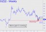 More pain is coming, since the July 15 low at 18.17 generated the first impulse leg we've seen on the weekly chart since this interminable correction began exactly a year ago. The low breached the distant, look-to-the-left external from last June by only a hair, but that's enough to allow the presumption that the C-D follow-through leg will have its way. It should reach p=18.53 at least, a midpoint Hidden Pivot that can be bottom-fished with the usual precautions. But if the support gets splattered, look for more downside to p2=17.37, or even D=16.22 in the Sep-Oct period.