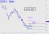 The A-B leg is sufficiently compelling that we can infer rates on the 10-Year Note are on their way down to at least 2.49%, a hair beneath the psychologically important 2.50% level. That would be a good place for a pause, but it is more likely that we'll see a bounce. It's too early to tell whether this would be the start of a strong, bullish reversal, but if so, it holds bullish implications for the big banks, if not for other sectors of the U.S. economy. Alternatively, if D=2.49% is easily penetrated, it would imply ore slippage down to 2.30%, or even 19.10%. Both targets come from a reverse pattern on the monthly chart.