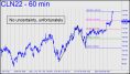 I am unable to find the pattern shown in Edwards and Magee's supposedly definitive book on technical analysis. None of their wedges, pennants, channels, flags or triangles exhibit the seeming power of this one, with its rising whatchamacallit juxtaposed against Q1's mountainous upthrust. There may be no precedent for such a globally important commodity as crude oil exhibiting this kind of behavior. But could the rally simply reverse nonetheless, sending quotes plummeting to levels that would be commensurate with the worldwide recession/depression that is brewing? I have been conflicted over this question, having argued both sides of it in recent commentaries. For the sake of clarity, however, I will treat the chart as I would any conventional ABCD, relying mainly on price action at the midpoint Hidden Pivot, 114.33, to tell us what is going on. It may turn out that last week's high, which fell 1.04 shy of C-D's midpoint, will turn out to have been an important top. If not and the futures popped through it this week, that would reinforce the case for a continued rally to as high as 140.12. Since that seems impossible with the current collapse in China's manufacturing sector, it can only imply, as I noted here earlier, that a catastrophic disruption in supply is looming. _______ UPDATE May 26, 5:42 p,m.) The futures poked slightly above the 114.33 midpoint resistance, but this is not technically significant. Let's see what the next day or two brings.