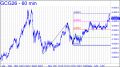 Friday's punitive reversal breached p=61.910 decisively, so the yellow flag is out. A tradable implication is that a rally now to the green line (x=63.497) would trigger a 'mechanical' short. The pattern could also prove useful for bottom-fishing the decline using the lesser charts to set up 'camo' triggers at p2=60.322 and d=58.735. We should also be alert to a possible breach of d. Although I don't expect it, that would signal a potentially bigger correction than the $6.35 selloff I warned about in the trading room.