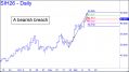 With its weak point 'A' low and its obviousness, the pattern shown should not be considered reliable for predicting a precise top. However, it can still serve us in several ways. For one, the easy move through p has shortened the odds of a rally to at least D=135.90. Also, a pullback to the green line would trigger a 'mechanical' buy sufficiently enticing that we should not want to miss it. And if p2=123.76 shows stopping power, that would validate the pattern itself and its target.