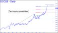 The daily chart yields two logical possibilities for a top, or at least a pause, at either of two prices: 5132.20, which I've been drum-rolling for a while; or 5300.50. The latter represents an extension of the A-B leg that features a highly unorthodox low labeled A2. Both targets are sufficiently compelling to suggest that bulls will not easily get past them. The patterns, while not in-your-face obvious, are easy enough to identify that we should not expect them to show precise stopping power. Let's therefore be prepared for a stall in a place no one is watching: 5129.60, midway between p2 and D of the larger bottom. Notice that it coincides with the lower target at 5132.20, implying there will be double stopping-power there.