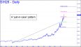 The chart replicates the pattern I've used to project a 5300 target for Feb Gold. The corresponding target for GDXJ is 151.42, and although the pattern, like the one for gold futures, starts with an un-kosher point 'A' low, it should prove more than good enough for government work. In fact, it provides an anchor that visually suggests that 151.42 will be a resistance point of consequence. It is the highest target I can project with unexceptionable coordinates. Using a longer-term chart here is not particularly useful for creating new point 'A' beginnings because it would simply recall whatever relatively undramatic lows occurred with GDXJ trading beneath $40. Some of the ups and downs back then may have felt like a big deal, but in the context of the big move up that has occurred since August, they were just grassy bumps on a rural airstrip. _______ UPDATE (Jan 26, 12:02 p.m.): Like much else in the bullion world, GDXJ has gone all lunatick-y, starting today's session with a wildly exuberant gap to the 151.42 target advertised above. It has spent the day so far diddling this Hidden Pivot, but the already 70-cent overshoot has practically guaranteed still-higher prices. I am able to project them only by using 'extension patterns' along the Big Picture's C-D leg, but what would be the point? Query me in the chat room if you get desperate for further guidance.