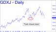 The short-term bearish picture for this symbol is congruent with my outlook for Comex gold and silver. Since trading is all about avoiding bumping heads with a thousand clowns, we should wait until GDXJ stops them out with an inevitable dip beneath the twin lows from early February pennies beneath 121. On the daily chart, the trigger interval for getting long thereafter would be 3.65 points, but we can probably cut that by 90% by pulling a trigger pattern from the lesser intraday charts.