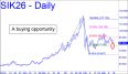 I don't like this bullish pattern as much as the one I've featured in the Gold tout, but it is certainly good enough for government work. It suggests that May Silver will become a fetching 'mechanical' buy when it touches the green line (x=77.043). Keep in mind that x is not a support, a target or a Hidden Pivot, just a place where we organize certain types of trades. The implication is that the futures could keep falling all the way down to c=63.667 before they turn around. At that point, the position would be showing a loss of slightly less tha $67,000 per contract. Obviously, the trade is only for those who can handles the risk and who know how to set up small-pattern triggers to get aboard. Because of the look of the pattern, the trade rates a '7.8', which, although very appealing, is significantly lower than my rating for the gold trade.