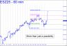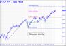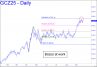 Switching from the November contract to the December yields a somewhat higher target at 3751.20. Like the earlier target at 3719.70, this one looks likely to be reached. However, the odds of an overshoot have improved by a tad. That's because the futures spent a whole week consolidating just beneath the 'D' target, which would be a lot of work just to produce a marginal pop to a new high a mere $36 above the previous one. Regardless, we'll be ready to get short there cautiously, since the pattern is compelling, even if too obvious to predict a top precisely. UPDATE (Sep 18, 12:08 a.m. EDT): Fed “news” caused the futures to head-fake to 3744.00, slightly above yesterday’s all-time high. Having frightened themselves with this breakout, traders then retreated $64 to leave our short offer unfilled. The target remains valid, although it is no longer a good bet for us.